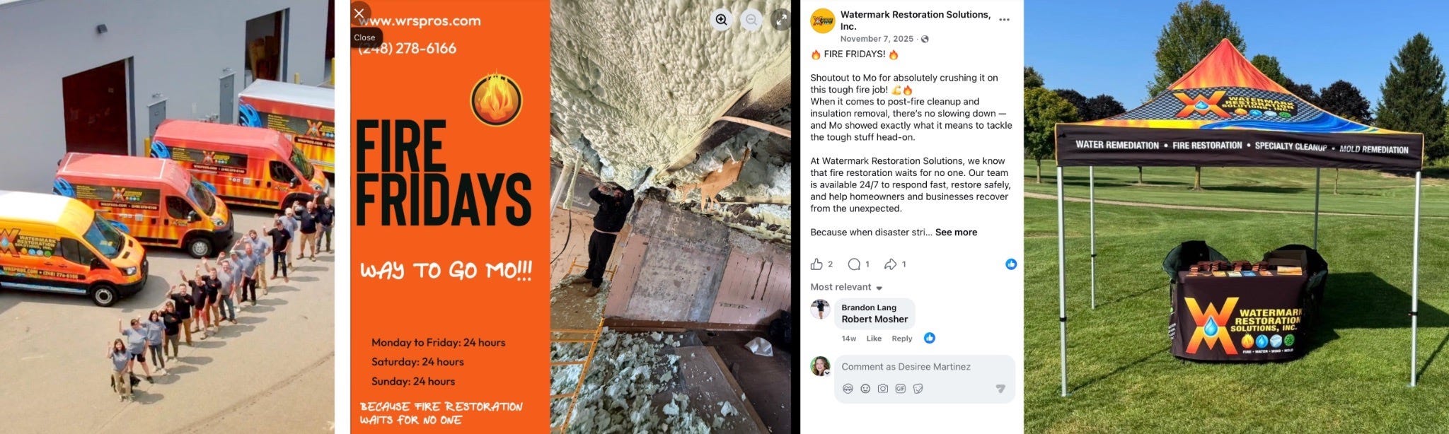 My friend owns a restoration business called Watermark Restoration Solutions and my kids can spot ‘Uncle Chris’s’ van every time we are out and about in town. Those orange, yellow, and black vans are an iconic part of the rhythm of the town. That same brand recognition can be seen on their website, their social media posts, their booth stand, flyers, uniforms, everything.